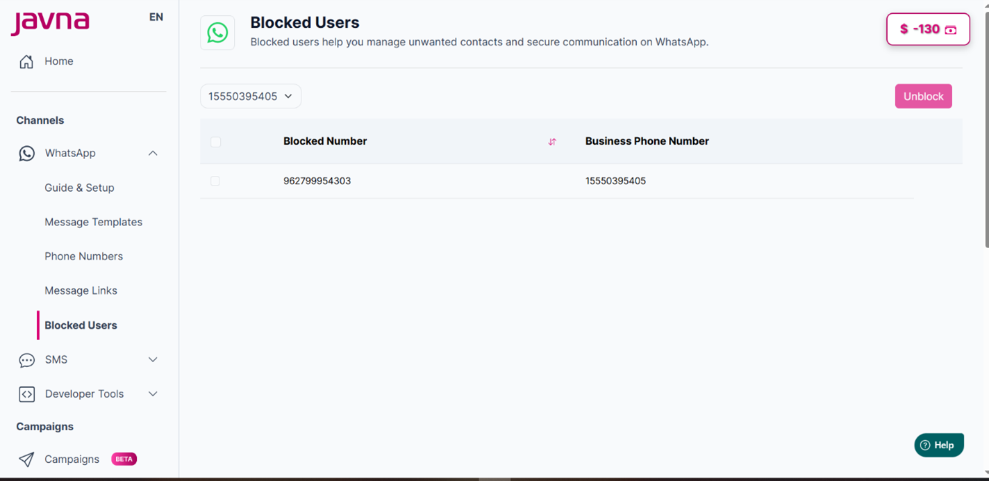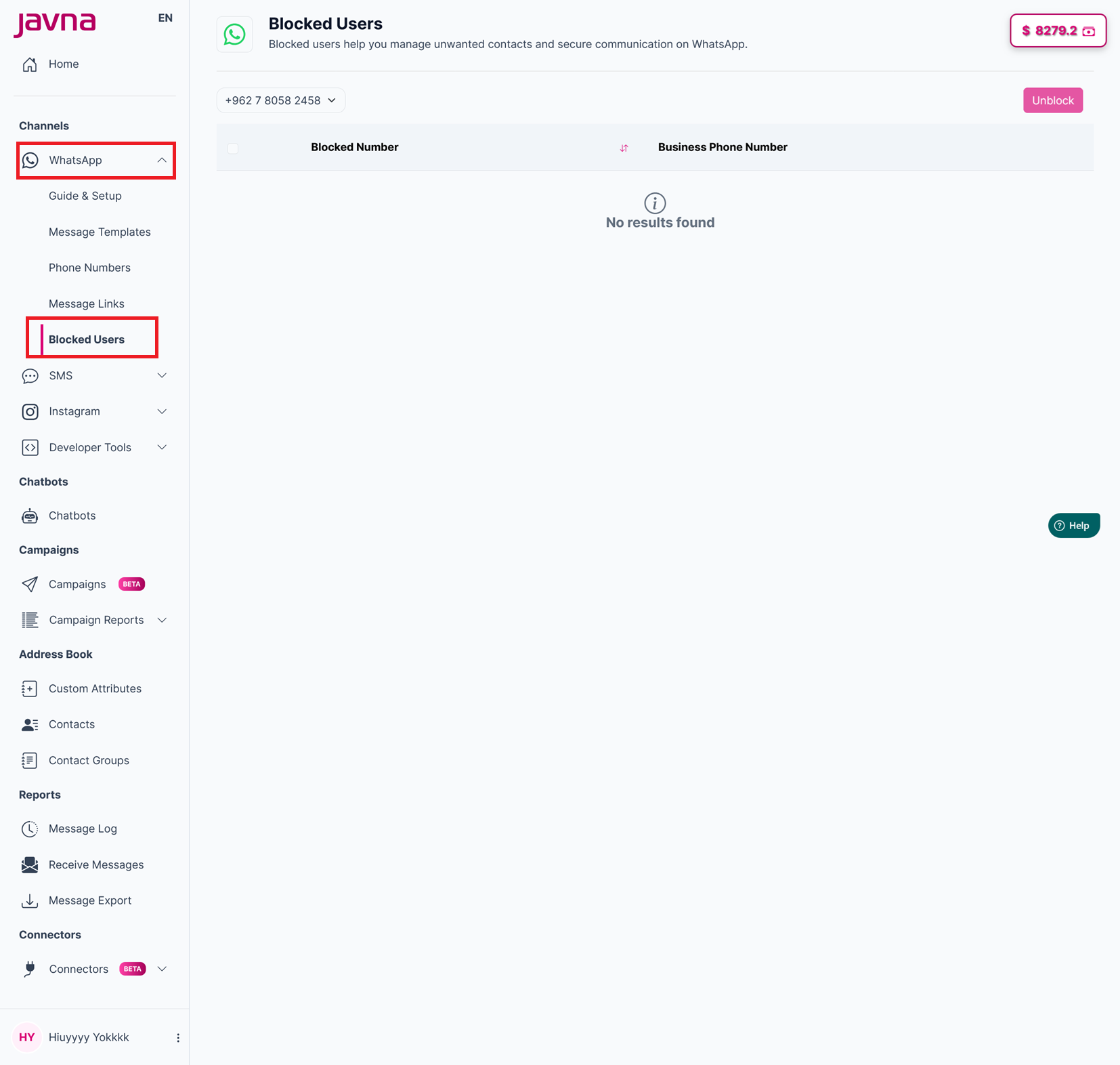 from the left-side menu of the homepage, click on the "WhatsApp" drop down menu, then click on the option labelled "Blocked users".