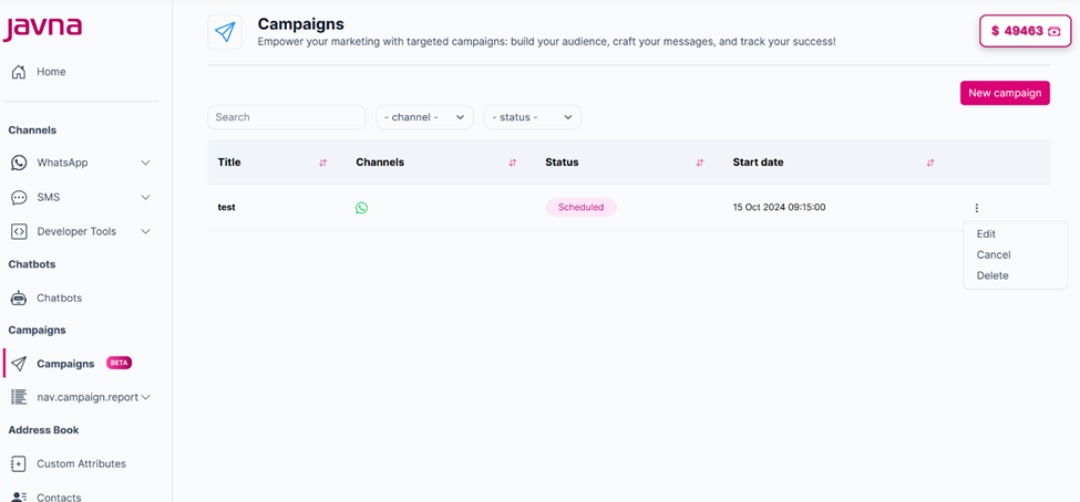 - Once your campaign is created, a confirmation message will appear. And the campaign will be added to the campaign list along with its status and details. For scheduled campaigns, the status will be shown as "Scheduled."