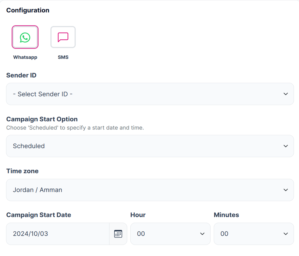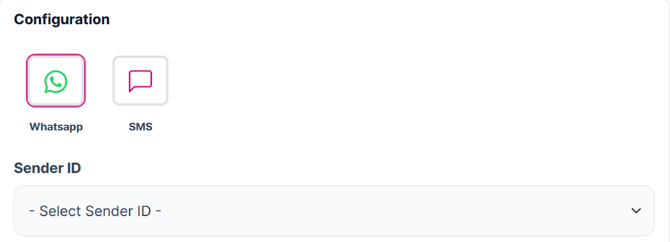 - SMS: If you select SMS as your communication channel, you will need to choose an SMS Sender ID from a dropdown menu. This field is mandatory.