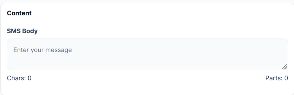 The SMS Body will display the character count (Chars: 0) and the number of message parts (Parts: 0) by default. These values will update as you type your message.