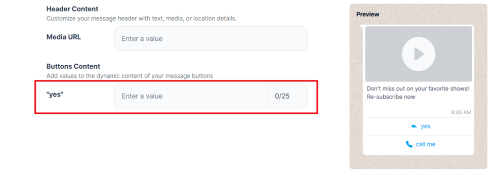 Important Notes in Message Templates: If the selected message template includes Quick Reply Buttons, you will need to fill in a value for each button. This value will not be visible to recipient users for your message, but it will be sent to the business as an inbound message when the user clicks the button.