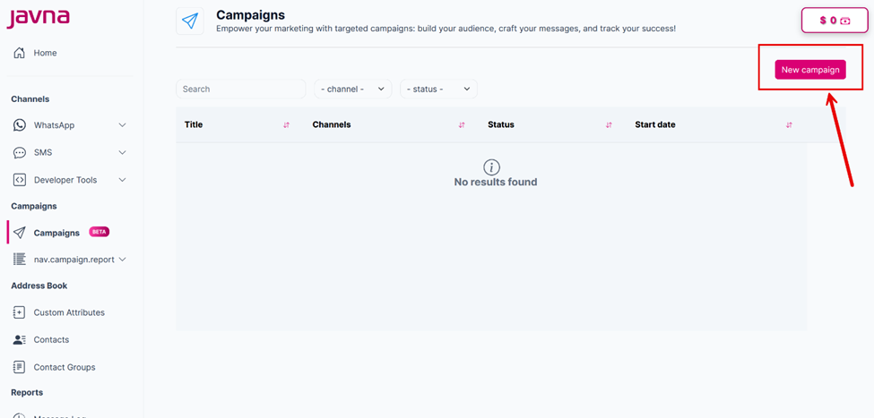 - Click on the “New Campaign” button, which is located at the top of the Campaigns page. You will be redirected to the “New Campaign” page.