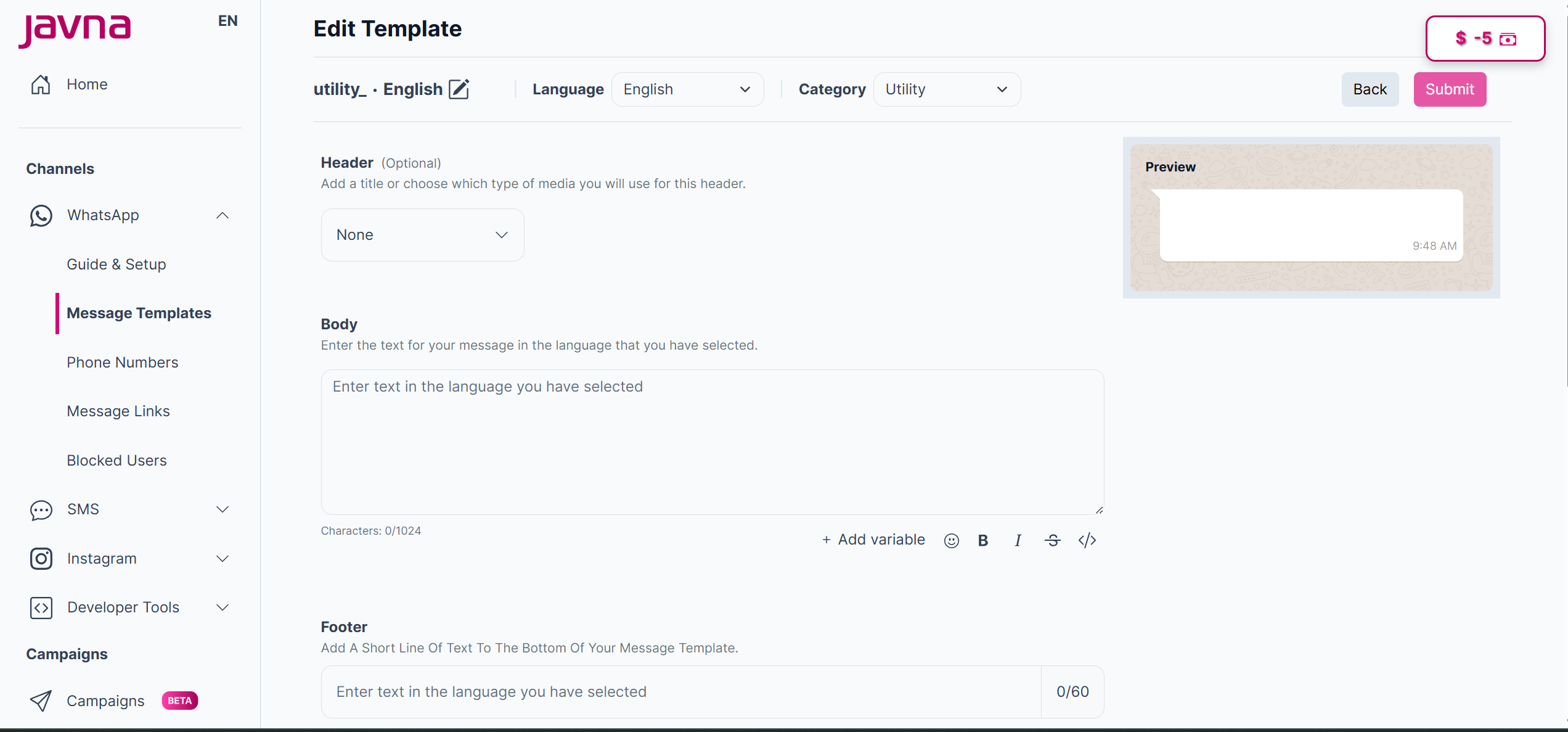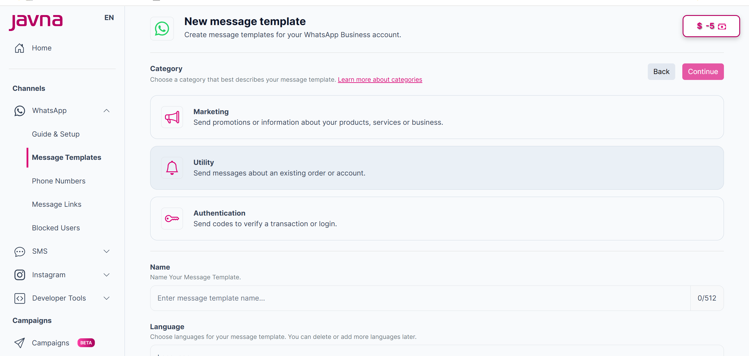 - Navigate to the “new template message” page and choose the utility category. Refer to this section "Creating Message Template" .
