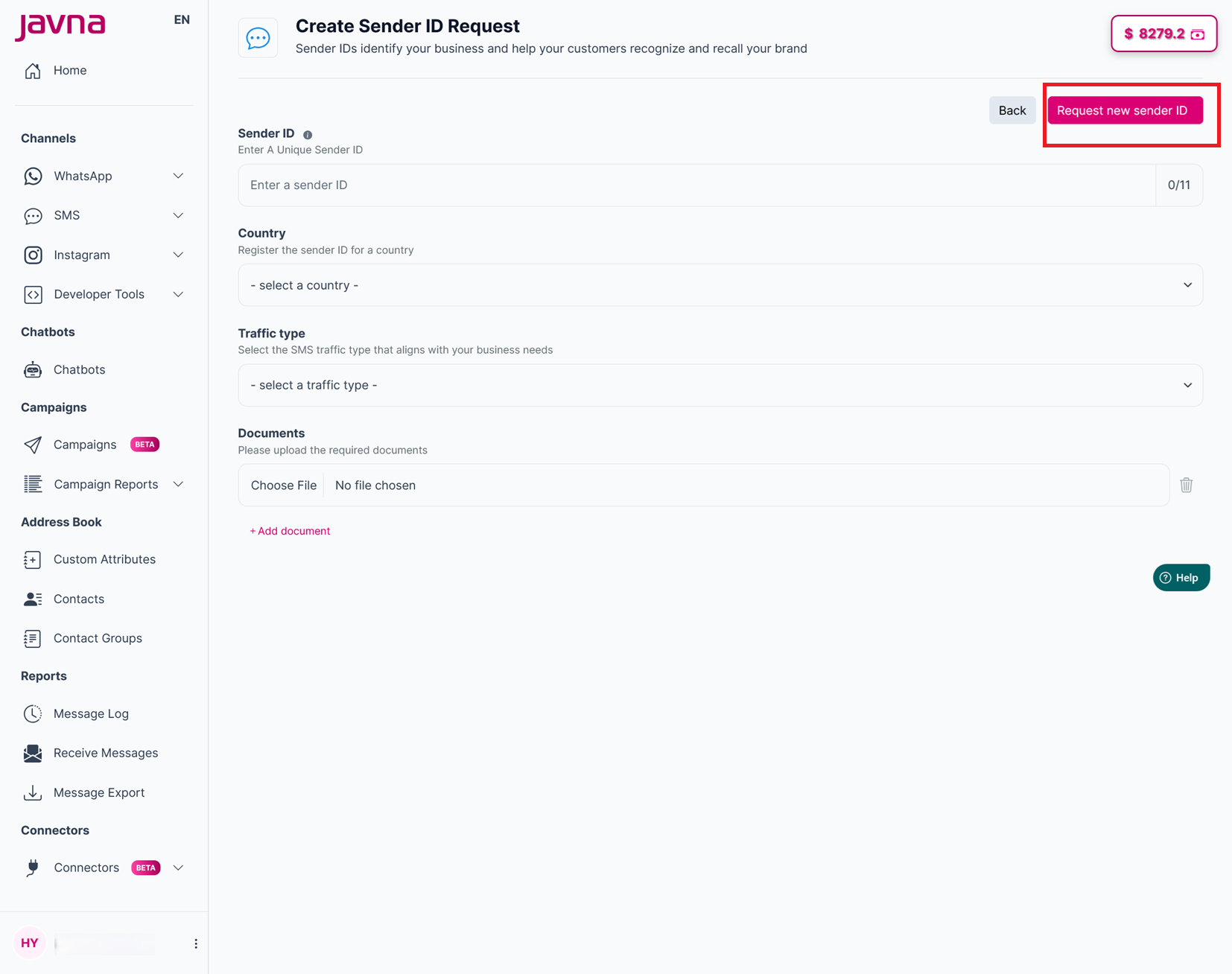 1- Navigate to the “Sender ID Request Section”.