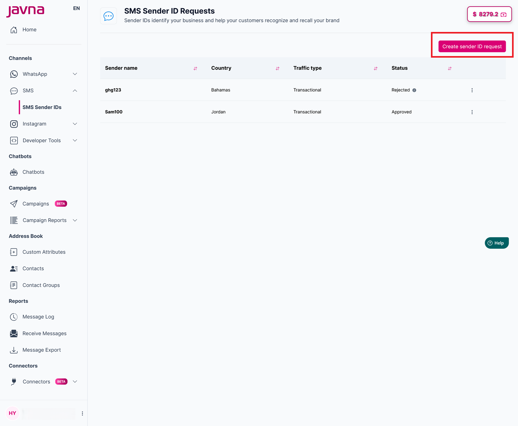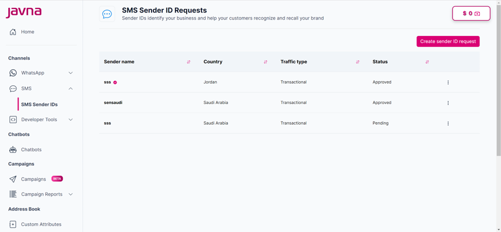2- From the “SMS Sender ID Requests” page, click on the “Create Sender ID Request” button.