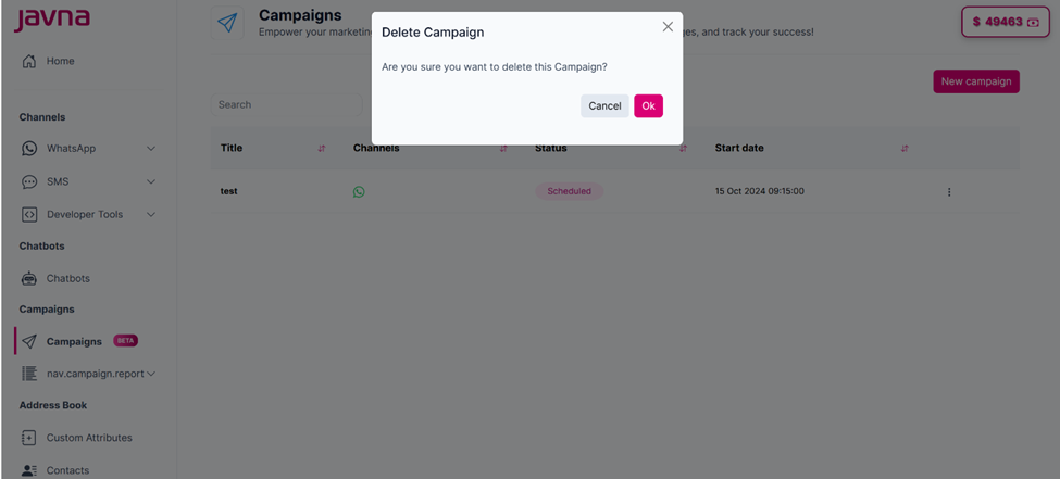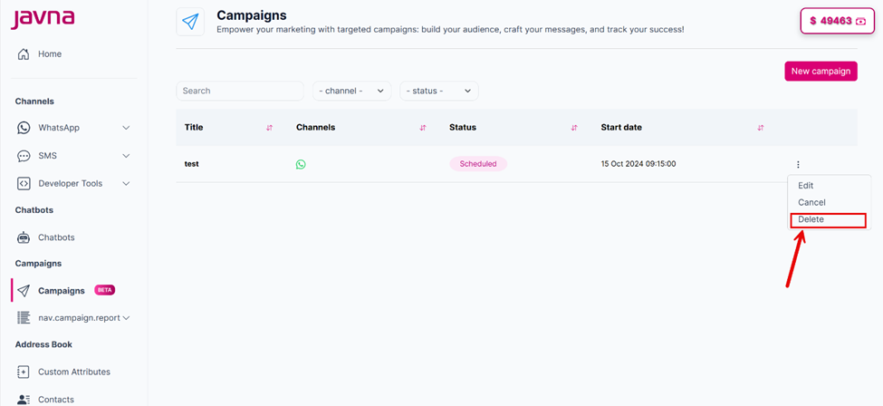However, if you decide to delete a scheduled campaign, click on the “options menu” button, select the "Delete" option, and confirm the deletion process.