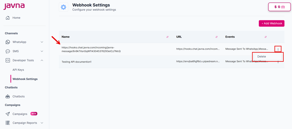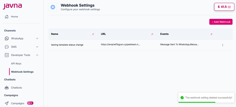 - The webhook will be removed from the list and a confirmation message indicating that the webhook has been deleted will appear.