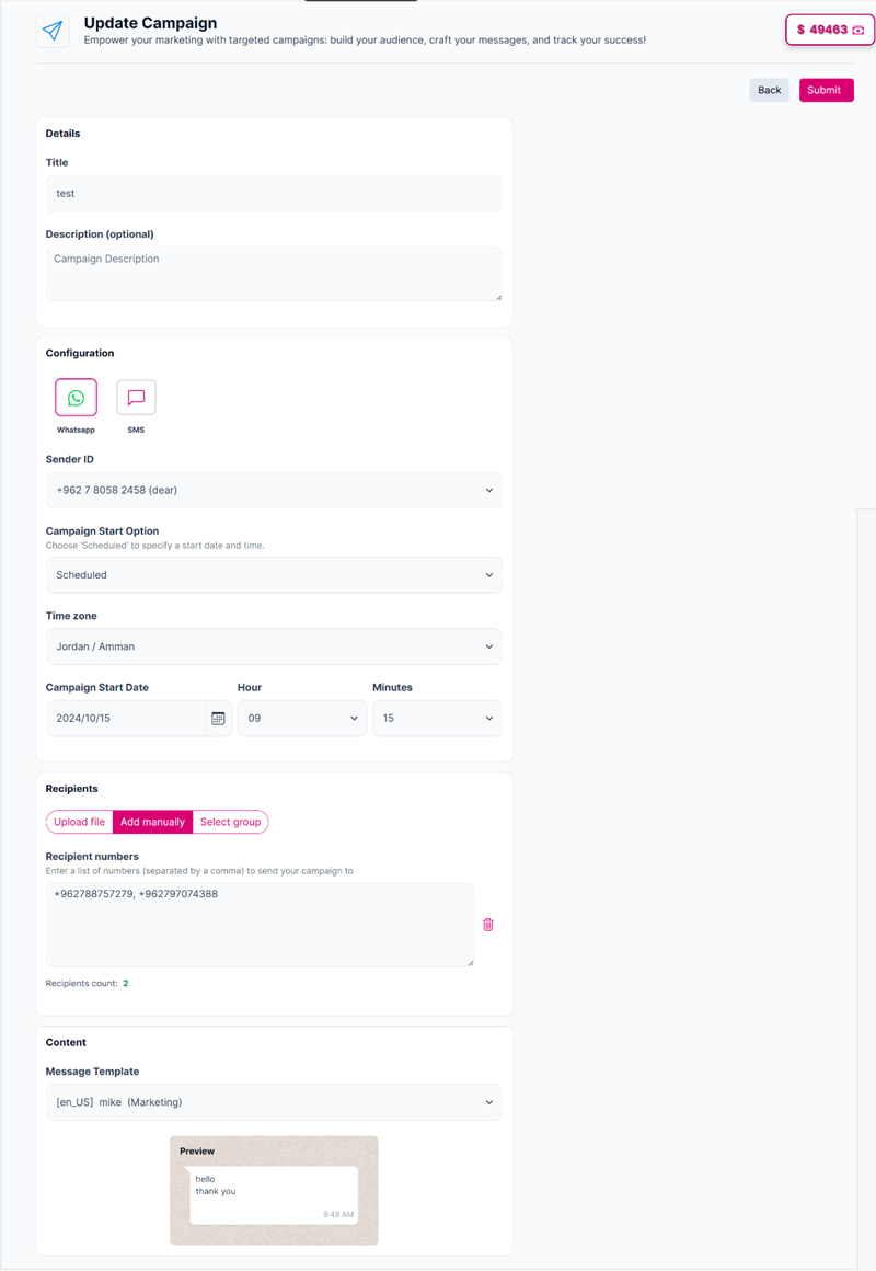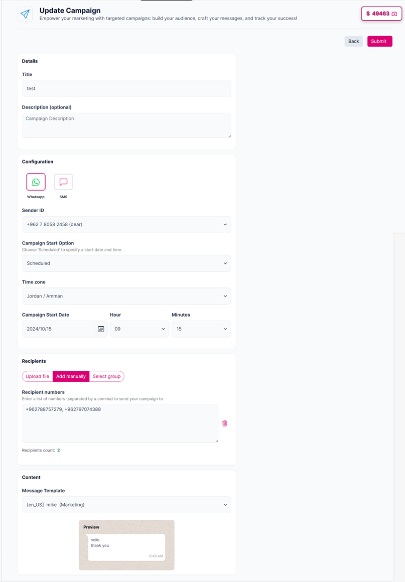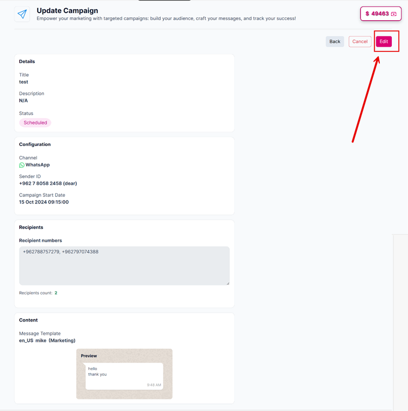 Editing the campaign details after clicking on the edit button