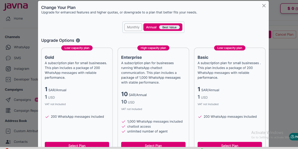 - Upgrade: Move to a plan with higher quotas or more features. Upgraded plans are shown at the top for easy selection.