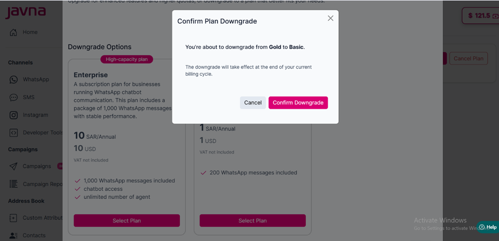 The "Confirm Plan Downgarde" pop up