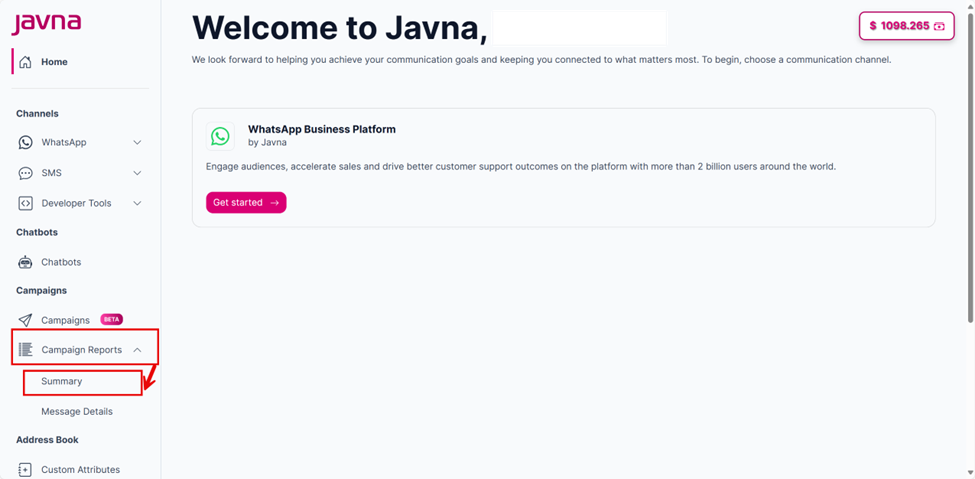 - From the left-side menu on the homepage, click on the “Campaigns Reports” button, then select “Summary”. You will be redirected to the “Campaign Summary” page where you can check detailed information on message delivery, failures, and pricing.