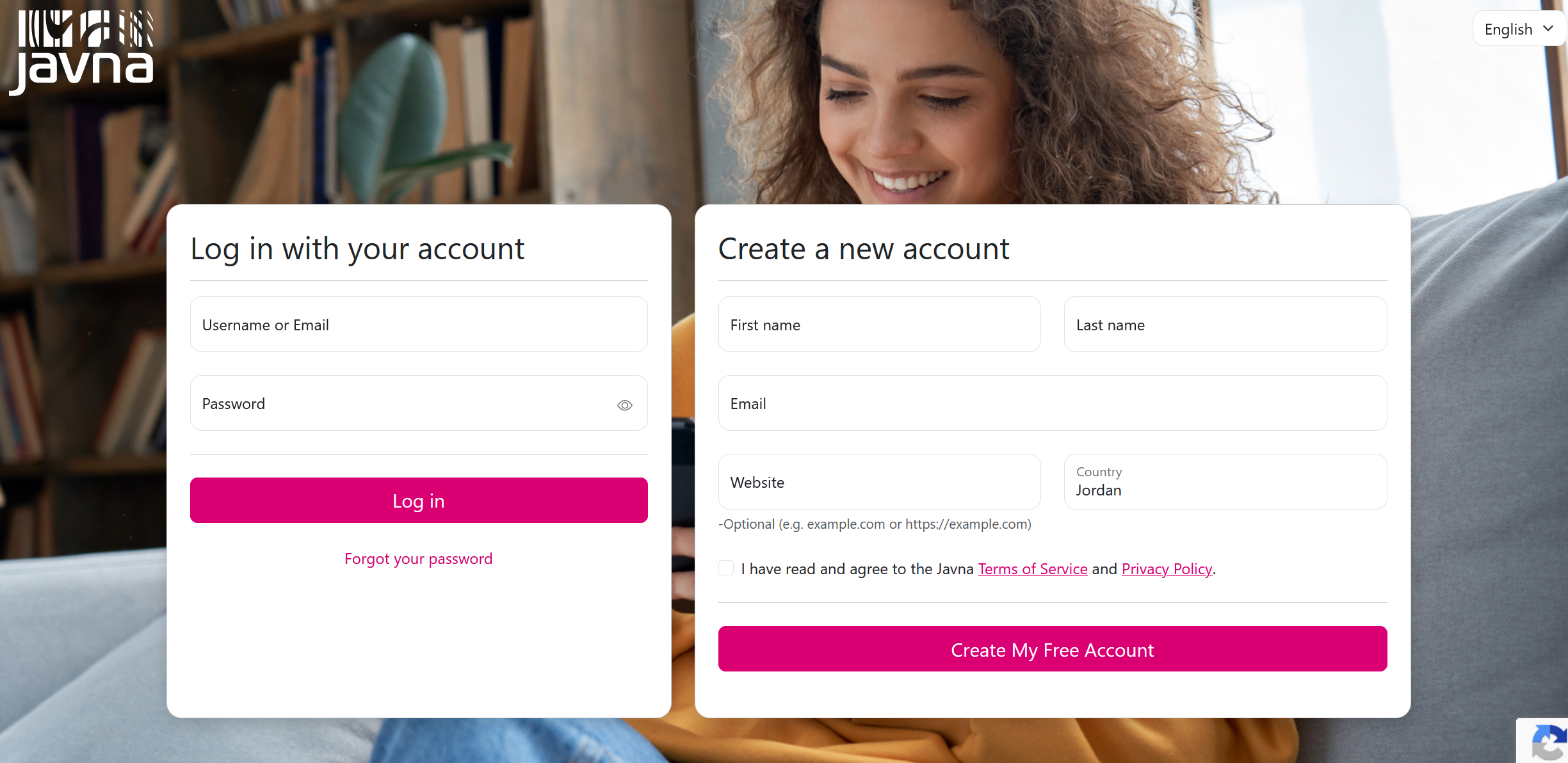 - Open your web browser and go to the Javna CPaaS website. On the main page, you will see two sections: "Log in with your account" on the left and "Create a new account" on the right.