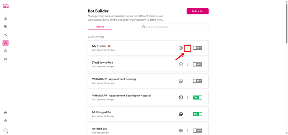 - Select the chatbot you wish to edit, then click on the options menu located on the right side of the chatbot.
