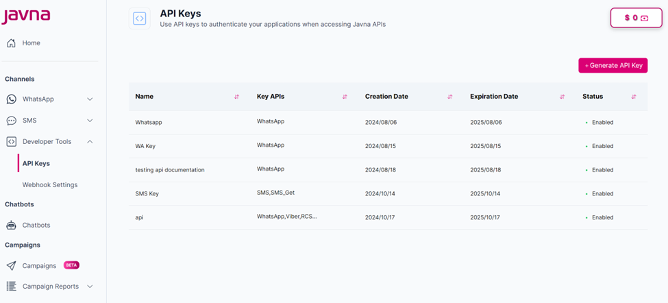 - Upon clicking, you'll be redirected to the "API Keys" page where you can view list of API Keys and Generate an API Keys as needed.
