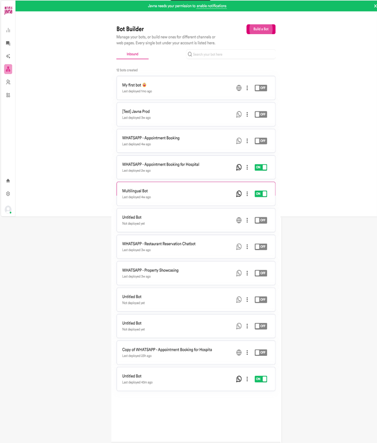 - From the left-side menu on the homepage, click on the “Chatbots” button. You will then be redirected to the “Bot Builder” page, where you can manage your existing bots or create new ones. This page lists all the bots associated with your account.