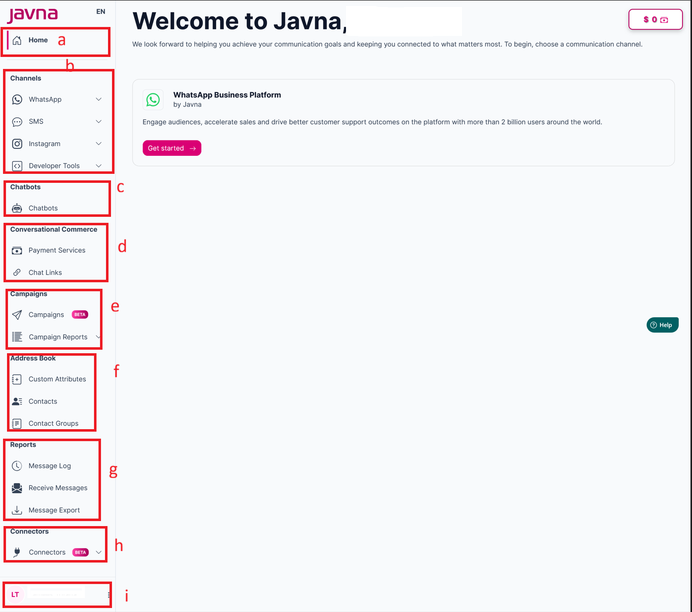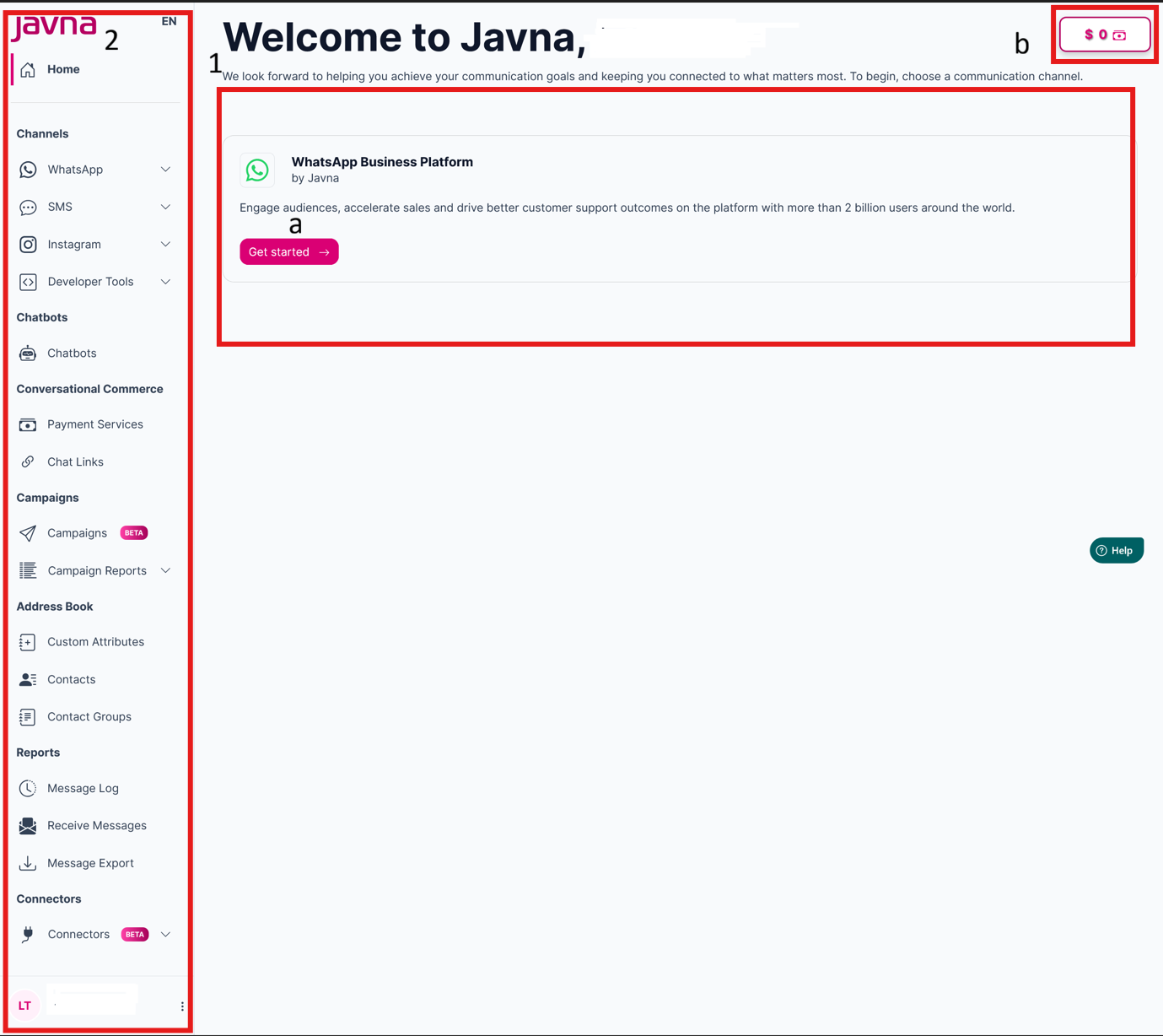 After logging in to Javna CPaaS, you will be redirected to the homepage of your account. This page serves as a centralized hub for accessing important features of the platform.