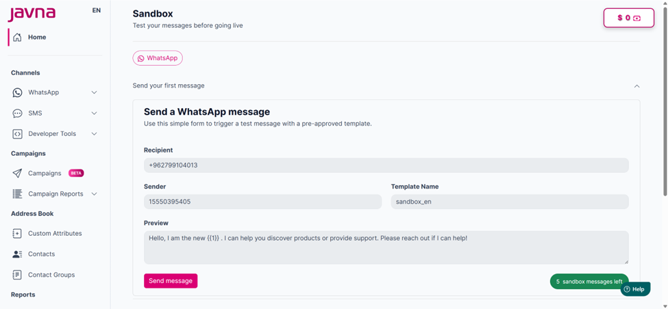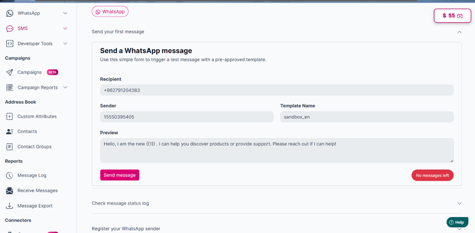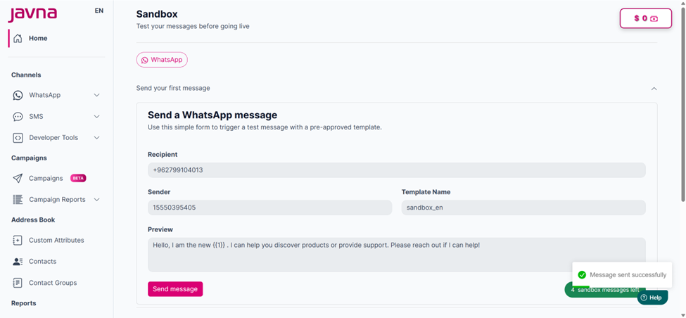- When you click on the “Send Message” button, a confirmation message will appear indicating that the message was sent successfully. The remaining sandbox messages (e.g., '4 sandbox messages left') will also be displayed.