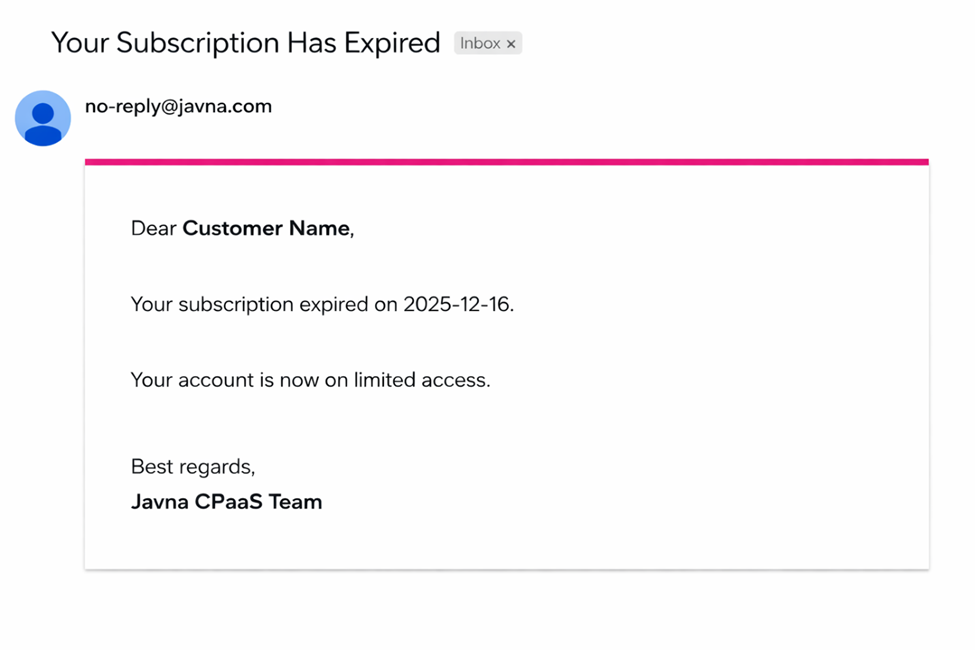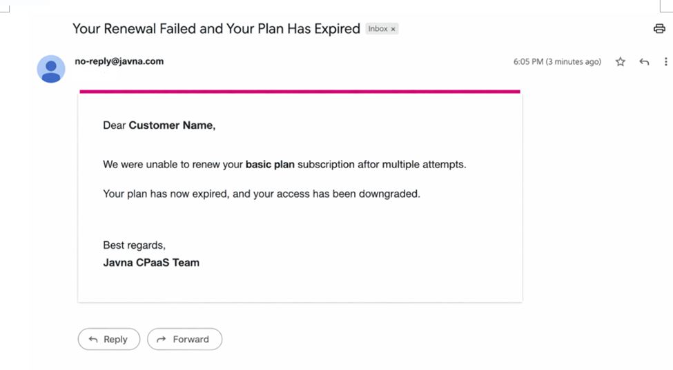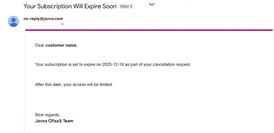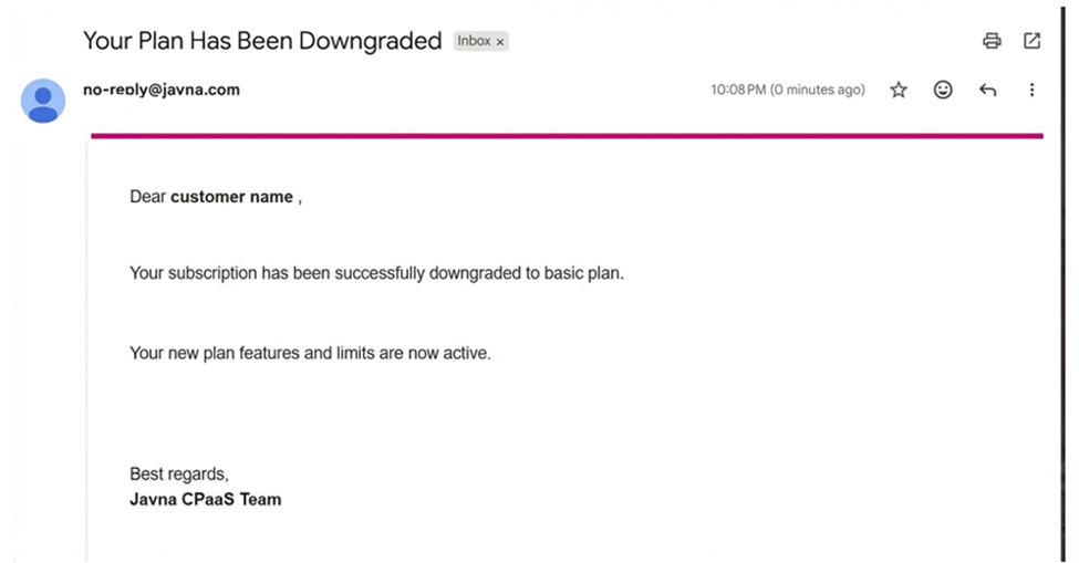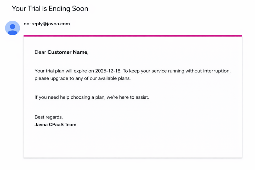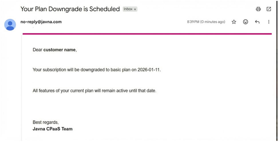 Your account will receive email notifications for various subscription and plan events. These help you stay informed about your plan status and upcoming actions.