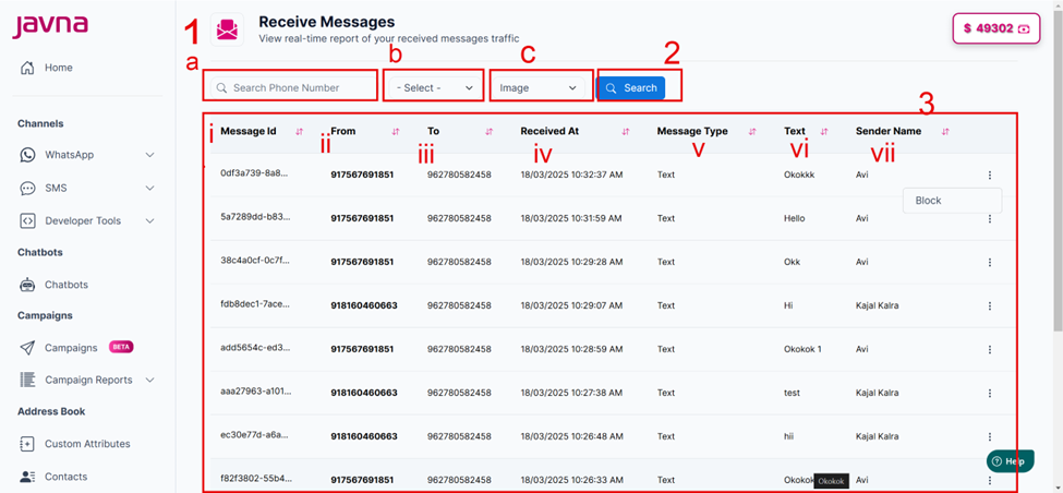 viii. Each message row includes a dropdown menu with options. One of the options is "Block", which allows you to block the sender if needed.