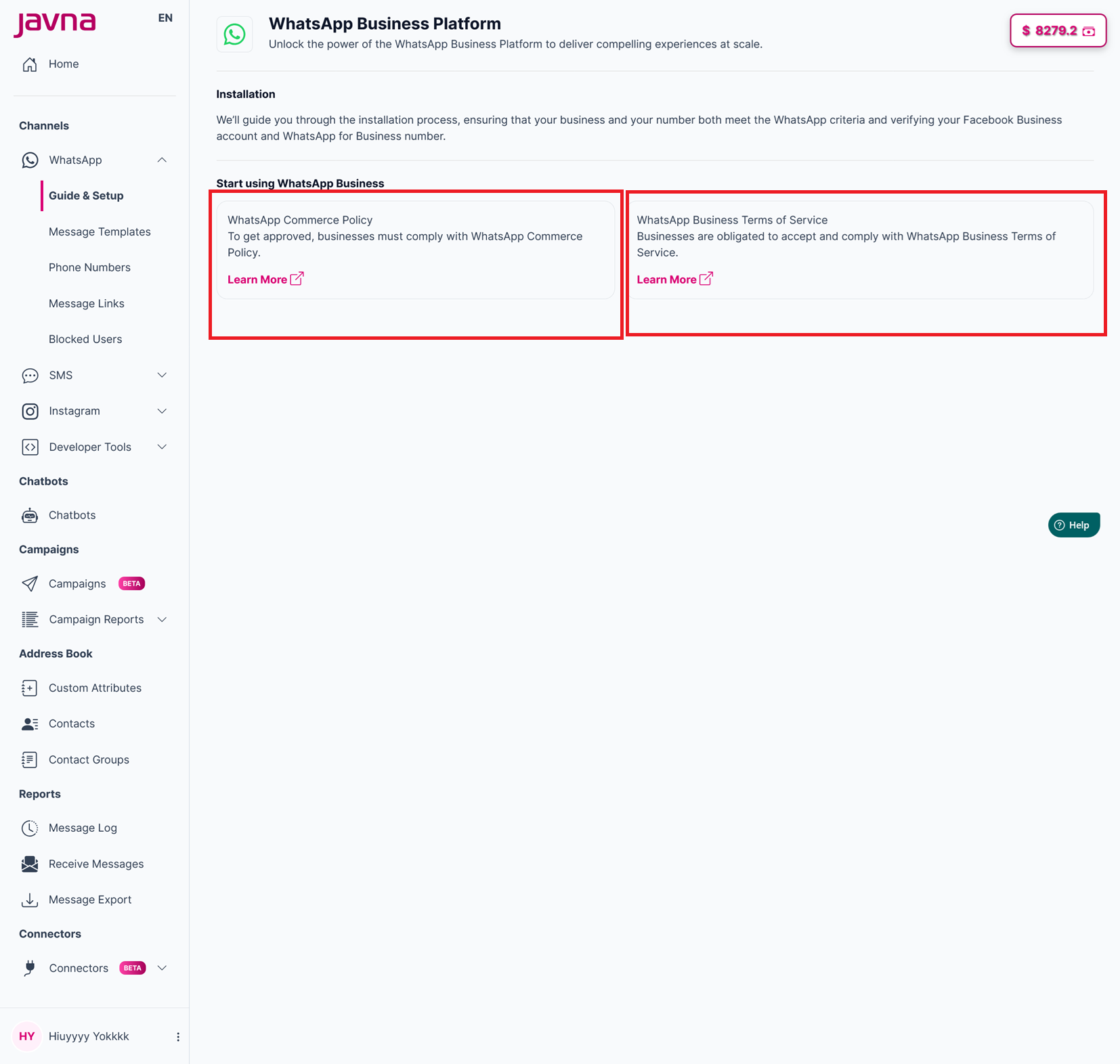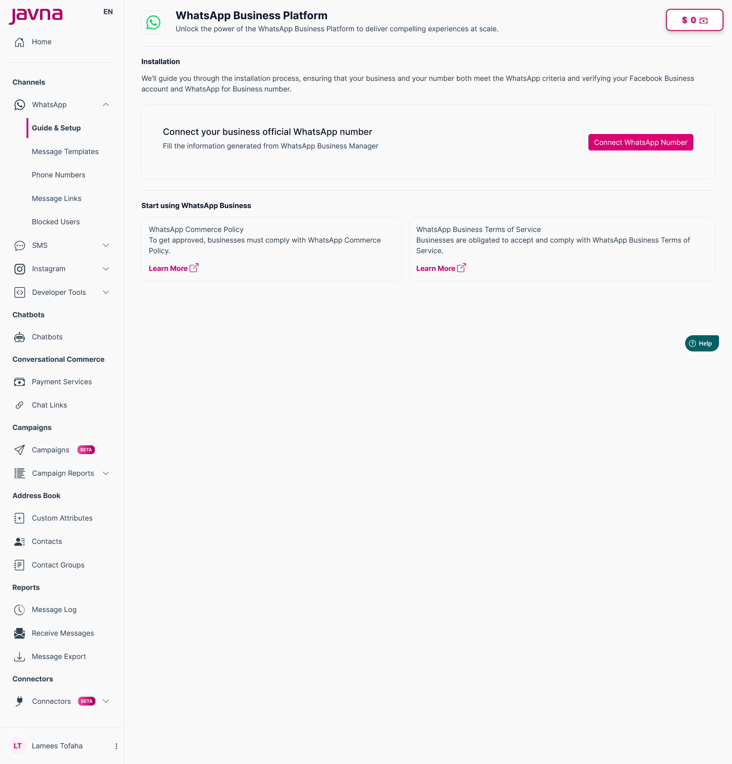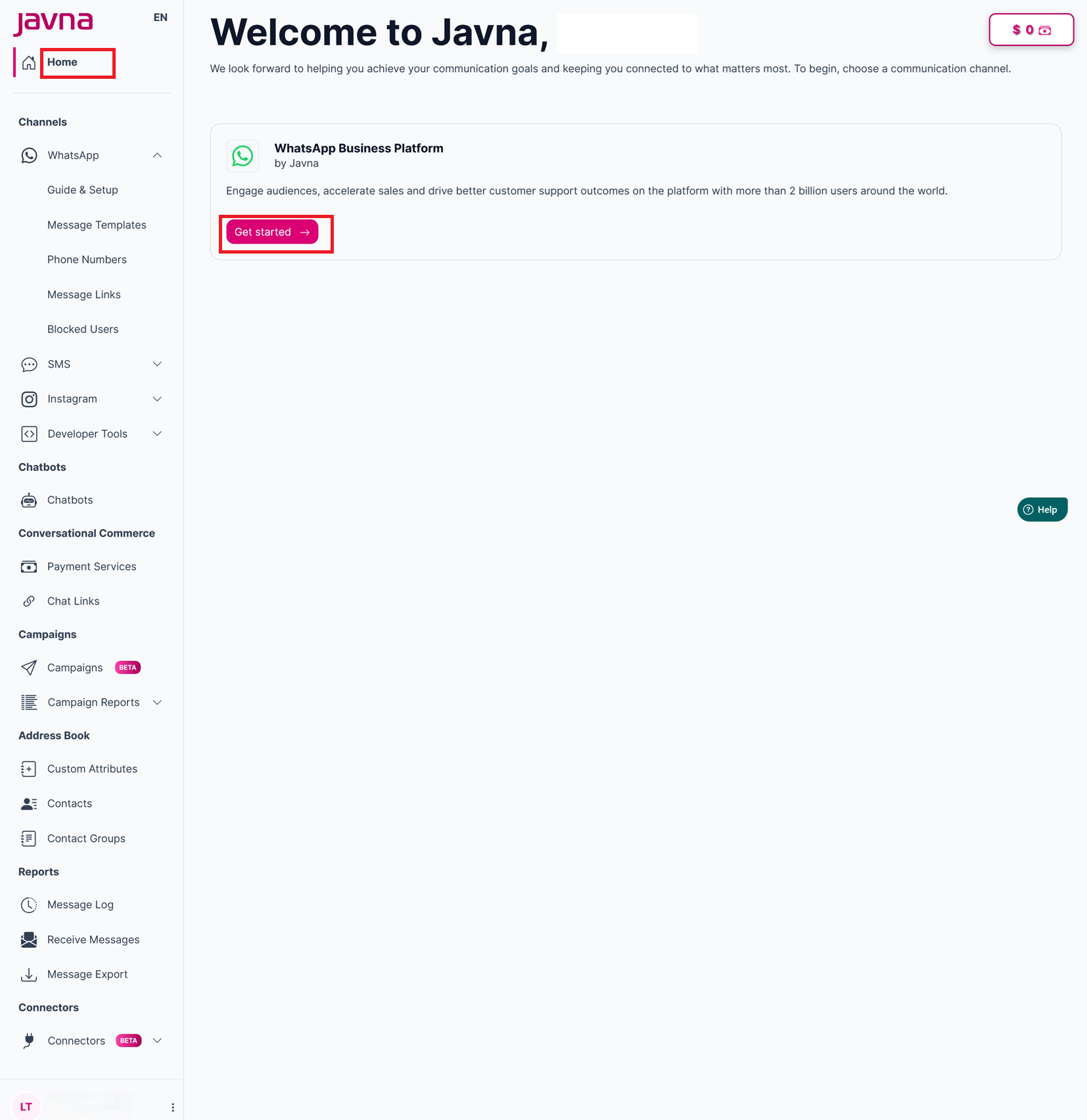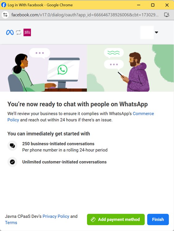 - Click on the "Get Started" button to connect your account. By doing this, you agree to the WhatsApp Business and Meta Terms of Service and let Javna manage your account.
