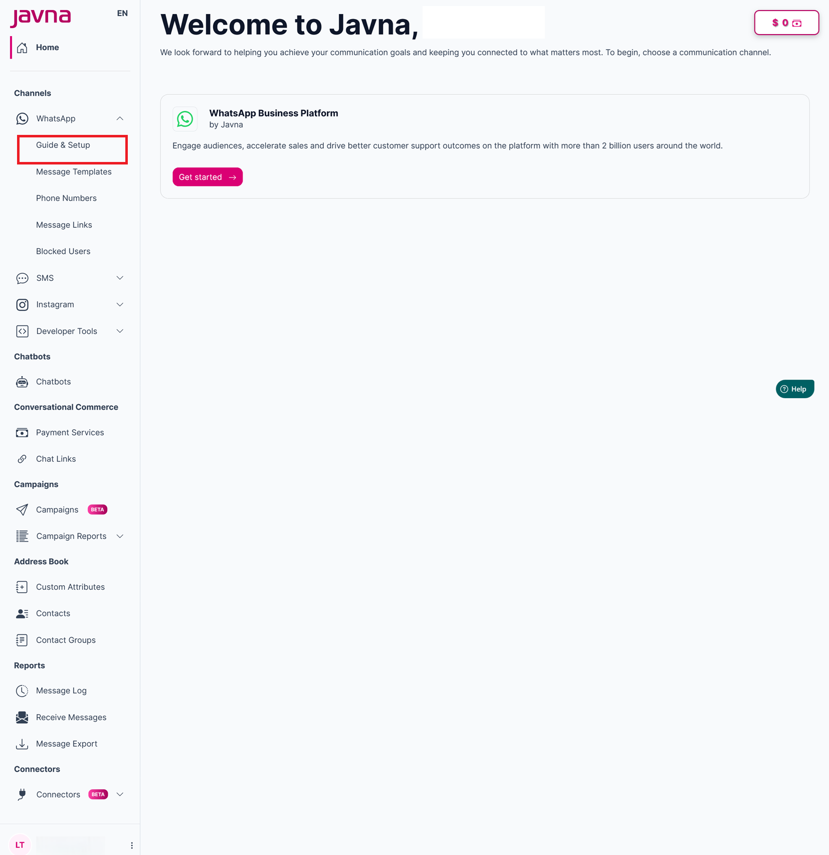 - Click on the "Guide & Setup" button under the WhatsApp submenu on the left.
