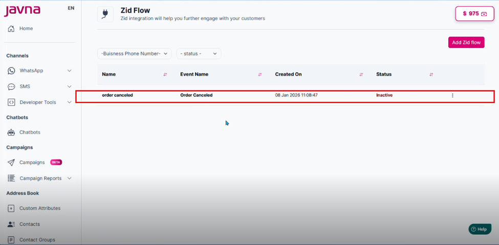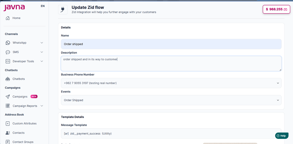 You can update an existing Zid flow to modify its name, description, event, business phone number, message template, or mapped data elements. This allows you to keep your automated WhatsApp messages accurate and aligned with your current business needs. Instead of creating a new flow, simply select the flow you want to edit from the table. You will then be redirected to the Update Zid Flow page, where you can apply the required changes and save them.