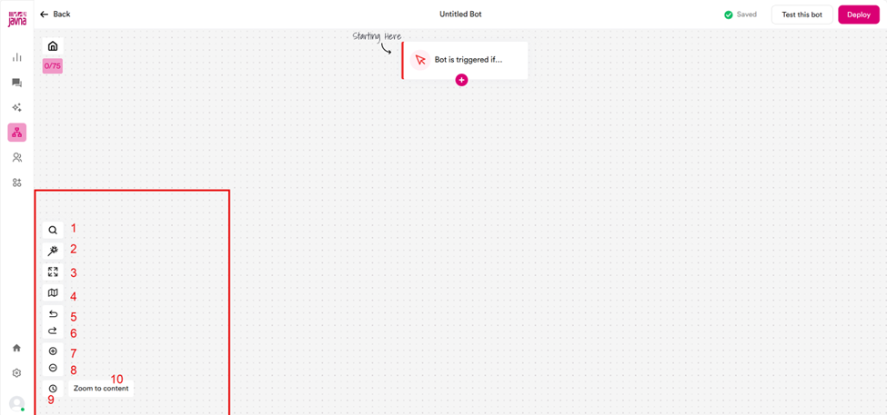 While building your bots, you may have noticed a lot of tools on the left side of the screen designed to assist you. Below is a list of the available utility tools: