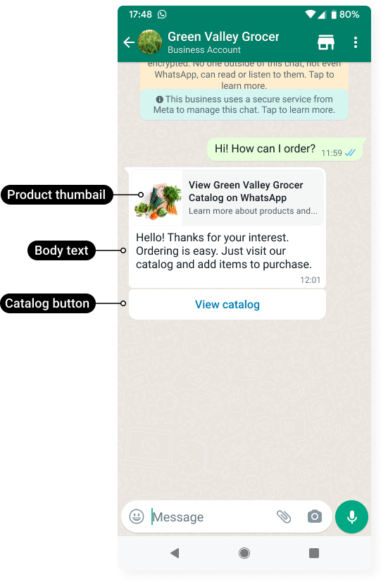 - Catalog Messages: Catalog messages are messages that allow you to showcase your product catalog entirely within WhatsApp.